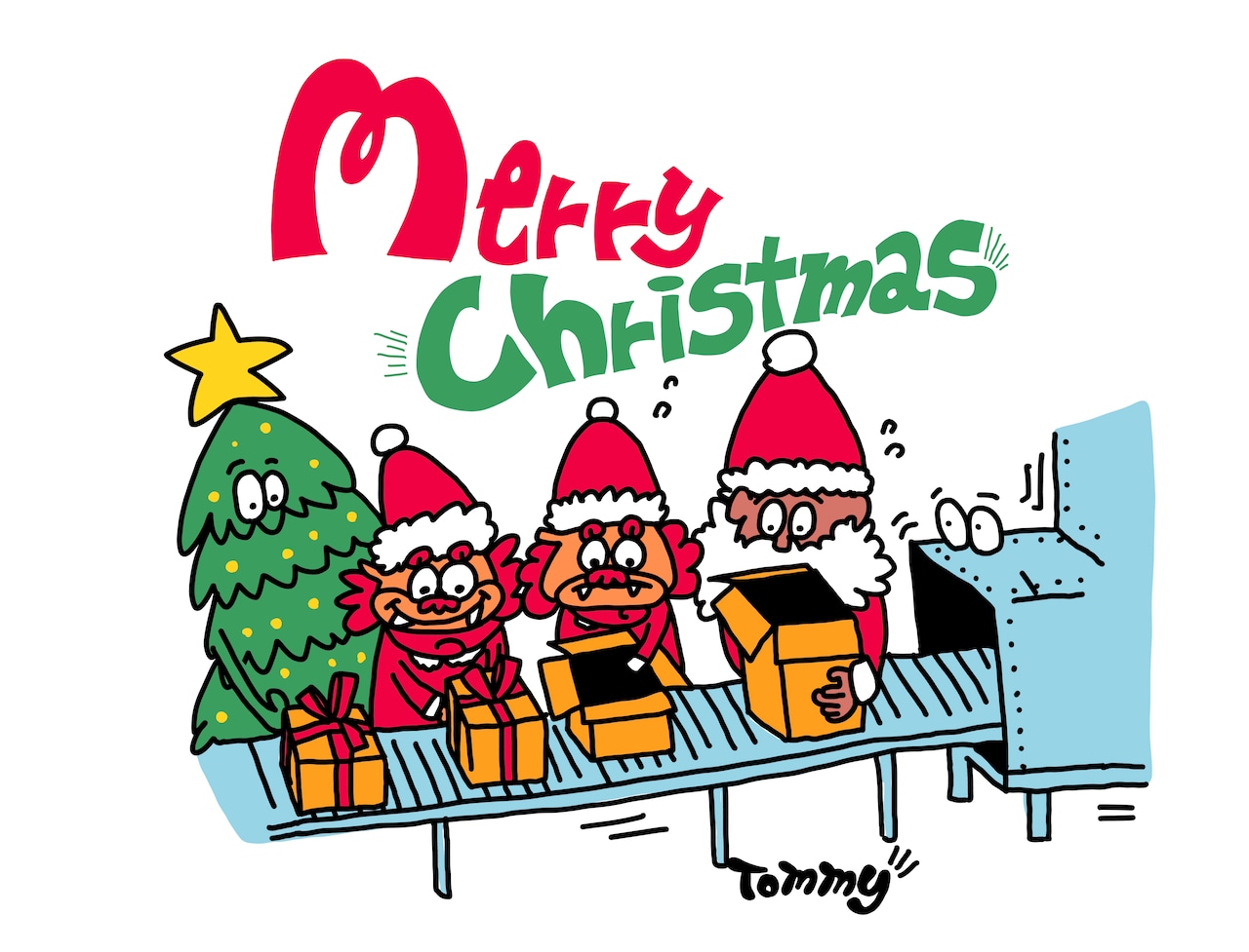1枚目はみんなでクリスマスの夜に運ぶプレゼントをせっせと詰めているシーン。