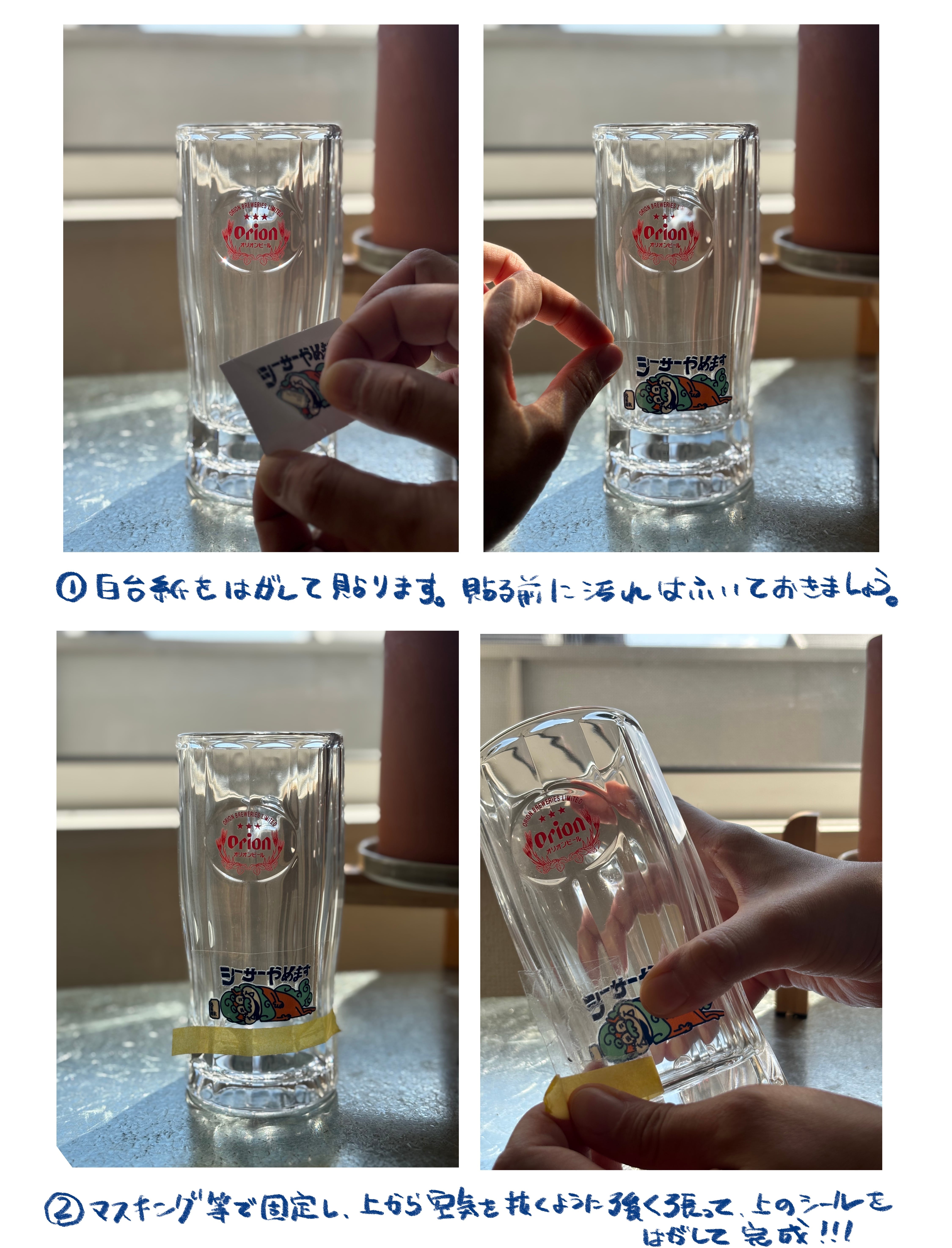 ④貼り付け・圧着: シールを端から乗せ、スキージー(ヘラ)やクレジットカード等を使い、空気を押し出しながら強くこすりつけます。中央から外側へ向かうのがコツです。
